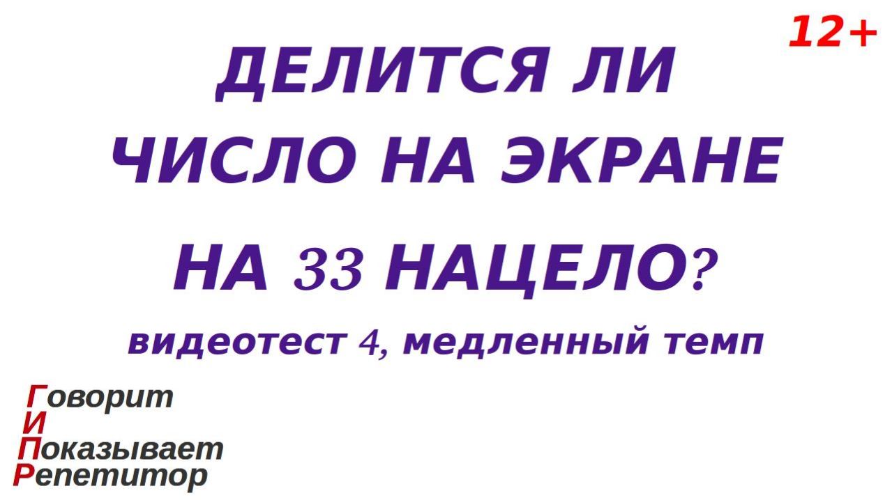 Категория 12+. Этот видеоролик - основа эпизода игры в репетитора и ученика и позволяет тренироваться применять признак делимости на 33 нацело (без остатка). Правила игры в этом эпизоде такие: после запуска видео репетитор-компьютер (планшет, смартфон, телевизор) показывает (отображает) на экране число, а вопрос репетитора следующий: "Делится ли изображенное число на 33 нацело?". Игрок-ученик должен дать ответ (вслух или про себя). Через некоторое время на экране появляется правильный ответ, с которым нужно сравнить свой собственный. Затем показывается следующее число и т. д. Цель игрока-ученика - дать как можно больше правильных ответов. Если все ответы верные, это считается абсолютной победой ученика в этом эпизоде игры. Я рекомендую это видео в первую очередь детям, осваивающим тему "Признаки делимости нацело". Таким образом, ролик представляет собой игровой видеотест, имеющий общие черты с программой-тренажером, дающей онлайн примеры и ответы на них. Показ числа длится 7,0 секунды, а ответа - 1,5 секунды. Это, на мой взгляд, медленный темп. Если тема игры Вам интересна и Вы добились успехов, рекомендую попробовать свои силы при помощи других видеотестов на эту же тему в медленном или даже в среднем темпе, а если после двух-трёх попыток просмотра ролика у Вас всё равно много (больше половины) неверных ответов, то я могу рекомендовать лишь пробовать повторять эту тему другими способами или консультацию специалиста по математике, который бы указал причину появления ошибок. Если же тема не интересна, то не забывайте - это игра и она не должна идти по принуждению. При создании ролика мной преследовалась следующая цель: дать ненавязчивый игровой материал, помогающий повторять пройденную тему детям, с которыми я, как репетитор, индивидуально вживую проводил занятия по арифметике и алгебре. При выборе примеров, времени показа примера, количества примеров в одном ролике, продолжительности ролика, используемых цветов и других параметров в первую очередь я полагался на результаты собственных наблюдений, полученных в процессе указанных занятий. А именно, конкретизирую, перечисленные и другие параметры выбраны так, чтобы на протяжении одного эпизода игры (времени показа одного видео) игрок-ученик мог давать больше половины правильных ответов и при этом не уставал. При таком подходе к созданию ролика главное, чего я добился в своей практике общения с указанными выше детьми, состоит в следующем: каждый игровой эпизод не вызывал отторжения, а наоборот, настраивал на продолжение игры, а, значит, на очередную тренировку вычислительных навыков без постороннего принуждения. Поскольку предлагаемая игра подразумевает развитие навыков, применяемых в образовательном процессе ребенка, ролик отнесён к категории "Образование". Но я подчеркиваю - ролик не создавался как образовательный материал, соответствующий государственным стандартам в сфере образования, методическим указаниям и рекомендациям для образовательного процесса, т. е. образовательным материалом он не является. Также, по моему мнению и отзывам некоторых моих подписчиков, результат моей работы оказался полностью или частично подходящим ответом на такие популярные поисковые запросы, как: - признак делимости на 33; - признак делимости чисел на тридцать три; - математика признаки делимости; - у