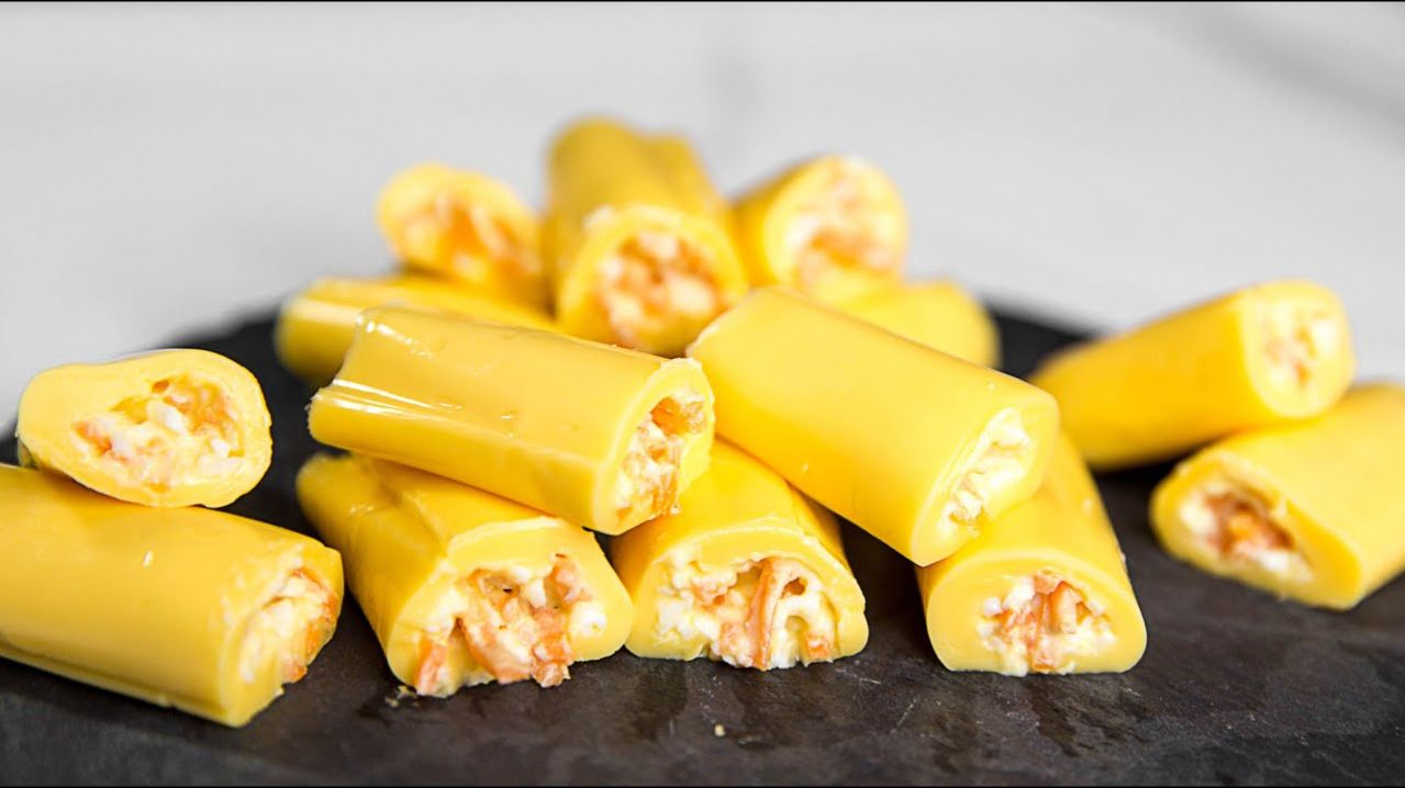 ✳️ СЫРНЫЕ ТРУБОЧКИ Ингредиенты: Плавленый сыр в пластинках 2 вареных яйца Морковь по-корейски Майонез Чеснок Яйца натираем на мелкой тёрке. Добавляем мелко нарезанную морковь, чеснок и майонез. Перемешиваем. Сыр раскрываем, но пленку не убираем. Выкладываем на сыр начинку, сворачиваем в рулетик и убираем в холодильник. ✳️ СЫРНЫЕ РУЛЕТИКИ Ингредиенты: 200гр сыра специи (например: кайенский перец, сушеный чеснок, копченая паприка) 100гр ветчины, карбоната, балыка или т.п. мяса в нарезке кунжут (по желанию)