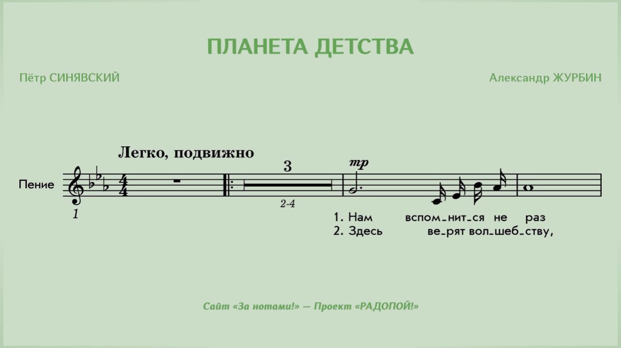 Планета детства (А. Журбин — П. Синявский) Разучите эту песню на нашем сайте: http://radopoy.zanotami.ru/index.html?namv2 ДЕМО: слушайте один куплет с мелодией. ПРОФИ: пойте песню целиком под «минусовку».