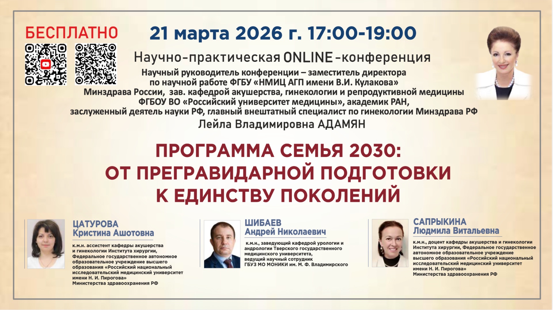 Научно-практическая онлайн конференция: ПРОГРАММА СЕМЬЯ 2030: ОТ ПРЕГРАВИДАРНОЙ ПОДГОТОВКИ К ЕДИНСТВУ ПОКОЛЕНИЙ В нашей стране активно реализуется государственная программа «Семья 2030», направленная на формирование гармоничных и здоровых поколений. Она основывается на комплексных мерах профилактики, прегравидарной подготовки и укрепления семейных связей, подчеркивая важность единства и ответственного подхода к репродукции для обеспечения благополучия и устойчивого развития будущего. Наша сегодняшняя конференция соответствует этим инициативам и посвящена ключевым аспектам репродуктивного здоровья и семейной гармонии: она затрагивает - основы здоровой беременности и успешного материнства, - комплексные вопросы мужского здоровья и фертильности, - особое внимание уделяется женской гармонии в менопаузальном переходе — важнейшему компоненту семейной стратегии и будущего благополучия поколений. Приглашаем участников конференции присоединиться к обсуждению этих важных тем, чтобы вместе способствовать укреплению здоровья семей и формированию устойчивых традиций счастливой семейной жизни. ------------------------------------------------------------- НАУЧНЫЙ РУКОВОДИТЕЛЬ КОНФЕРЕНЦИИ: АДАМЯН Лейла Владимировна Заместитель директора ФГБУ «НМИЦ акушерства, гинекологии и перинатологии имени В.И. Кулакова» Минздрава России, зав. кафедрой репродуктивной медицины и хирургии ФГБОУ ВО «Российский университет медицины», академик РАН, заслуженный деятель науки РФ, главный внештатный специалист по гинекологии Минздрава РФ ------------------------------------------------------------- СПИКЕРЫ: ЦАТУРОВА Кристина Ашотовна - к.м.н. ассистент кафедры акушерства и гинекологии Института хирургии, Федеральное государственное автономное образовательное учреждение высшего образования «Российский национальный исследовательский медицинский университет имени Н. И. Пирогова» Министерства здравоохранения РФ. ШИБАЕВ Андрей Николаевич - к.м.н., заведующий кафедрой андрологии и урологии Тверского государственного медицинского университета, ведущий научный сотрудник ГБУЗ МО МОНИКИ им. М. Ф. Владимирского. САПРЫКИНА Людмила Витальевна - к.м.н., доцент кафедры акушерства и гинекологии Института хирургии, Федеральное государственное автономное образовательное учреждение высшего образования «Российский национальный исследовательский медицинский университет имени Н. И. Пирогова» Министерства здравоохранения РФ. ------------------------------------------------------------- ПРОГРАММА КОНФЕРЕНЦИИ: 1) "ПРЕГРАВИДАРНАЯ ПОДГОТОВКА: ЗАЛОГ ЗДОРОВОЙ БЕРЕМЕННОСТИ И УСПЕШНОГО МАТЕРИНСТВА" ( Цатурова Кристина Ашотовна) 2) "МУЖСКОЕ ЗДОРОВЬЕ И ФЕРТИЛЬНОСТЬ: ОПТИМИЗАЦИЯ РЕПРОДУКТИВНЫХ ВОЗМОЖНОСТЕЙ МУЖЧИН" ( Шибаев Андрей Николаевич ) 3) "ЖЕНСКАЯ ГАРМОНИЯ В МЕНОПАУЗАЛЬНОМ ПЕРЕХОДЕ КАК ВАЖНЫЙ АСПЕКТ СЕМЕЙНОЙ СТРАТЕГИИ" ( Сапрыкина Людмила Витальевна ) «Дискуссия. Ответы на вопросы» Адамян Л.В., Цатурова К.А., Шибаев А.Н., Сапрыкина Л.В.