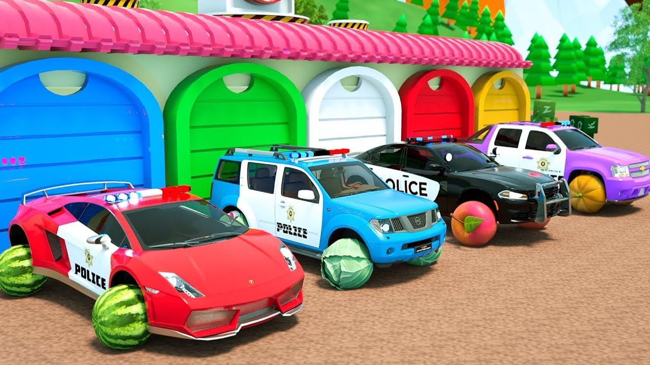 Разноцветные полицейские машины выезжают из гаража с новыми и необычными колёсами мультик для детей