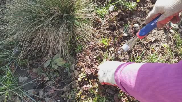 Испытываю ручной пропалыватель корней. Высадила Виолу в клумбу с первоцветами.