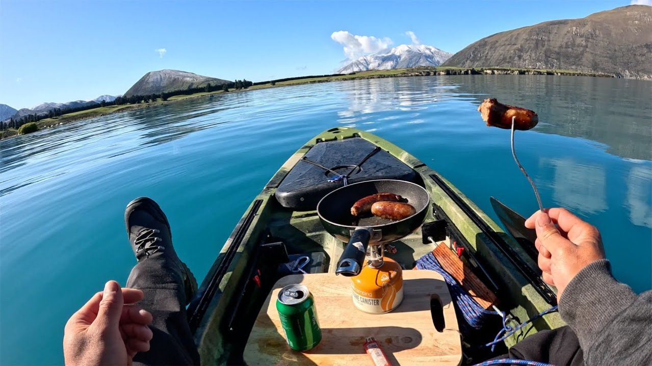 Жарю колбаски на борту своего каяка посреди озера
